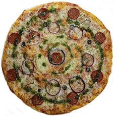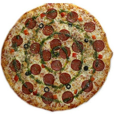 Состав: Тонкое Итальянское тесто, Соус Маринара, Сыр Моцарелла, Колбаски Черизо, Болгарский перец, Маслины, Орегано, Соус Песто.